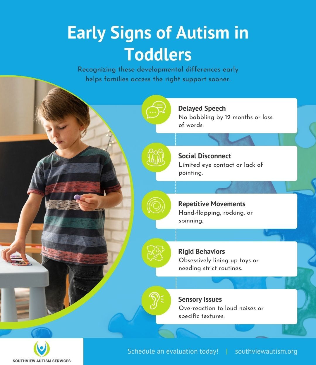 Trust your intuition if you feel your child’s development is off track. Early detection leads to the most effective support outcomes for the entire family. At Southview Autism Services, we are here to guide you through these next steps with compassion. Contact us today to schedule an evaluation or discuss our therapy options.